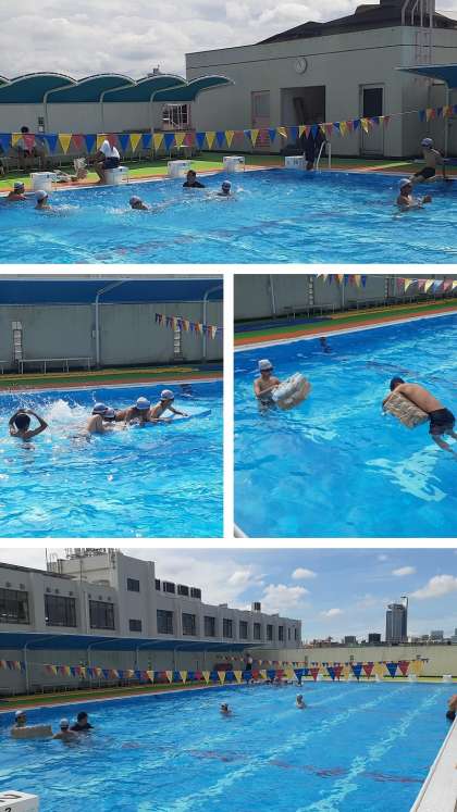 前半は25mを使っての泳法の練習を行い、後半は自由に楽しんでもらいました。やはり、中3といえども、子どもですかね? 友だちとのフロートを使って水遊びはとても楽しそうでした。2リットルのペットボトルを30本つなぎ合わせて作った、自前のフロートもあり、バランスをとって浮かんでいました。