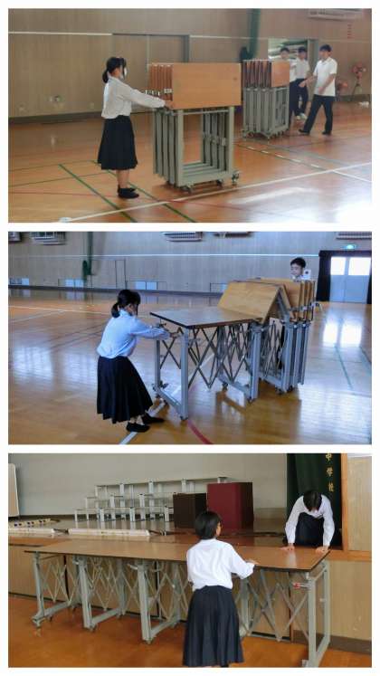 放課後に、フェスタ実行委員さんに手伝ってもらい、体育館の舞台前部に「張り出し舞台」を設置してもらいました。同時に、その張り出し舞台への昇降用の階段も左右に設置し、フットライトも配置替えを行いました。