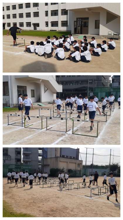 前回の授業から始めたそうですが、まずは、先生からハードルを越えるときの足使い、姿勢について説明を受け、まずは、近い距離に並べられたハードルを「跨ぐ(またぐ)」練習からです。