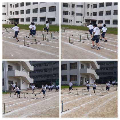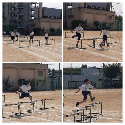 1年生男子の体育の学習の様子です。以前に紹介した2年生男子同様に、ハードル走に取り組んでいます。