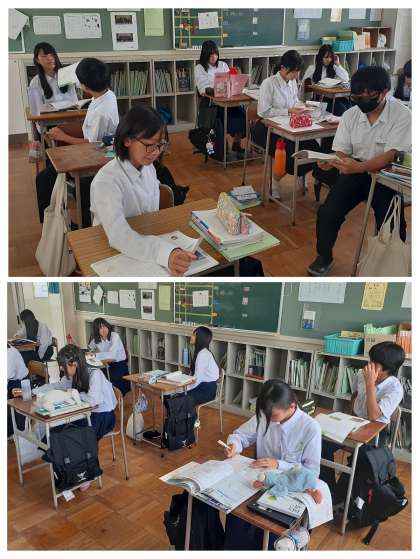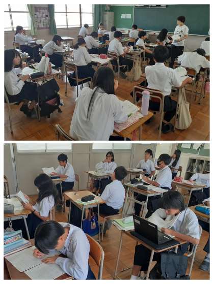 2年生の国語の学習の様子です。枕草子と徒然草の冒頭部分の暗唱に取り組んでいました。
