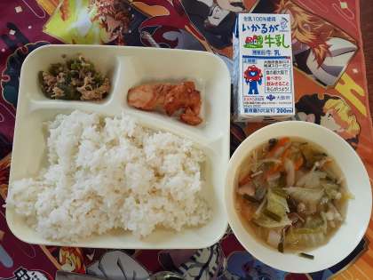 焼き豚のスープは、中華スープがベースで、焼き豚、白菜、玉ねぎ、人参、えのきたけ、ニラが具材です。いつもの通り、お野菜たっぷりのスープでした。