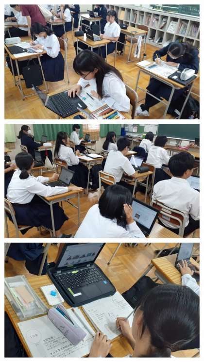 3年生の取り組みの様子です。実力テストも終わり、6時間目は、これまでに取り組んでいた「修学旅行新聞」の仕上げをしました。途中、フェスタ・スポーツ発表の部の練習があり、作成作業が止まっていました。