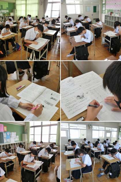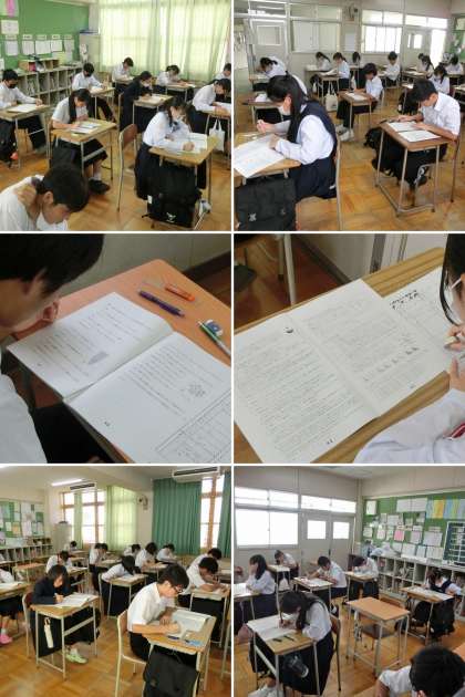 2学期の中間テスト第1日目を迎えました。雨が心配されましたが、登校時は曇り空でよかったです。生徒は予鈴までに余裕をもって登校し、教室では最後のテスト直前学習をしていました。