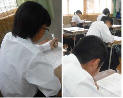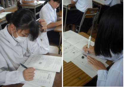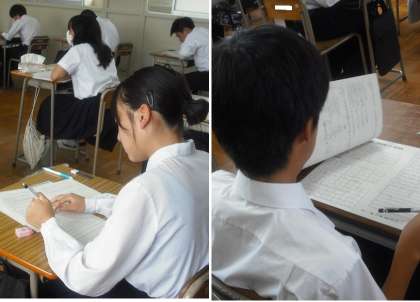 本日、中間テストの2日目です。全学年1限目「英語」2限目「数学」そして、1年のみ3時限目「技術・家庭科」のテストが行われました。どの教科も、生徒は真剣にテスト問題に向かっていました。3限目の1年生は、「技術」の分野で定規を使って作図する姿と「家庭科」の問題の解答をスラスラ書き入れる様子が見られました。
