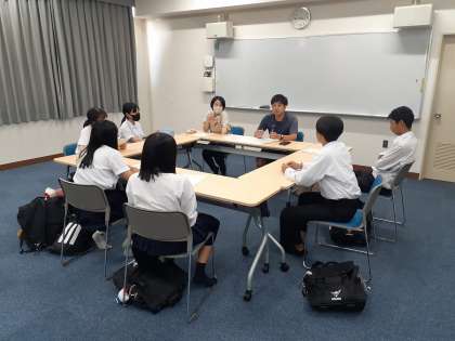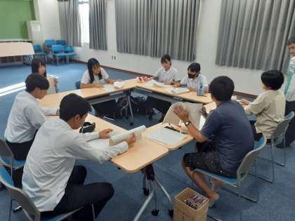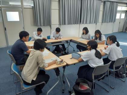 選挙管理委員は、各クラスより1名の選出です。多目的室に6名が集まり、顔合わせ、委員長の決定、仕事内容や今後のスケジュールの確認、選挙日当日の役割分担、そして、公示ポスターの作成も行いました。
