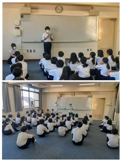 その後、先生からのお話です。内容は、先生が英語の先生になろうとしたベースのお話でした。小学校の1年生の時の様々な国の言語(挨拶)との出会い。中学校の1年生の時の英語の歌との出会い。どちらも、興味を持って、楽しんで必死に取り組んでいたことが、今の英語の先生という立場にあるのかな。皆さんも、ちょっとしたきっかけでいいので、「楽しんで」取り組んでほしい、とのお話でした。