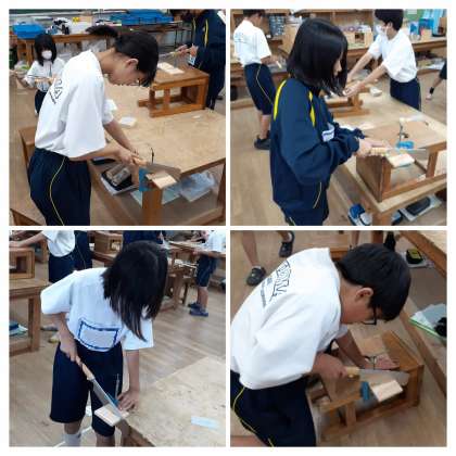材料をC型クランプでしっかり固定し、のこぎりの扱いを思い出しながら切断していきます。のこぎりをまっすぐに、できるだけ大きく前後に動かし、スムーズに切断されていました。2カ所目、3カ所目と進むうちに、切断スピードも速くなってきていました。