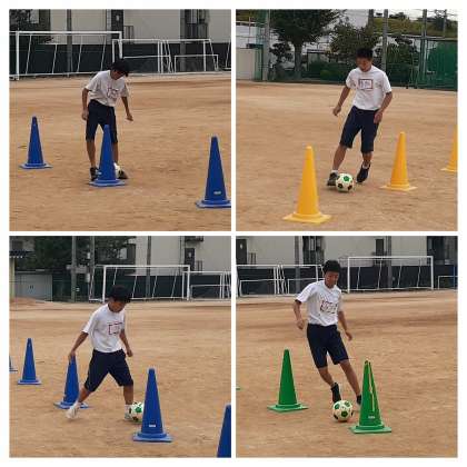 後半は、ドリブル練習です。コーンの間をジグザグにボールをコントロールして進んでいきます。時折、コントロールミスしたボールが大きくそれている光景もありました。