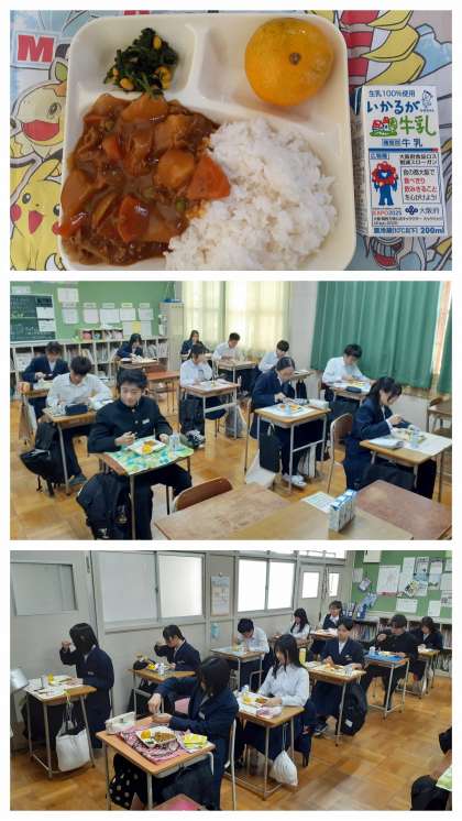 ポークカレーライスは、にんにくを綿実油で炒めて香り出しをし、豚肉、玉ねぎ、にんじんを炒めた後、じゃがいもとお湯を加えて煮込んでいきます。じゃがいもが柔らかくなれば、塩、ローレル、米粉で作ったカレールウの素で味付けをし、最後にグリーンピースが加えられています。大盛で、お皿からカレーが溢れんばかりの生徒もいました。
