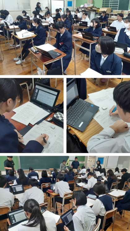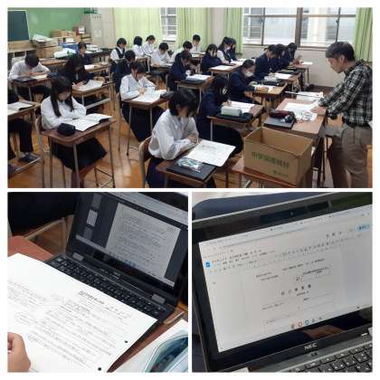その後、各クラスに戻り、生徒たちは、早速、学習者用端末を用いて、大阪府教育委員会の入試関連のサイトから、各自の志望校のアドミッションポリシーを真剣なまなざしで閲覧し、プリントにポイントを書き出し、「自己申告書」を書くための準備作業を始めました。