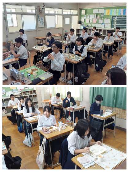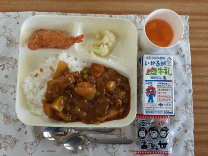 エビフライカレーライスは、冷凍のエビフライを綿実油でカリッと揚げ、配食時にご飯に添えてカレーとともにいただきます。カレーは、薄切りの牛肉、玉ねぎ、じゃがいも、人参の定番お具材で、仕上げに彩りでグリーンピースも入っています。今回もアレルギー対応のため、カレールーの素は米粉で作られたものを使用しています。