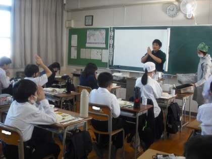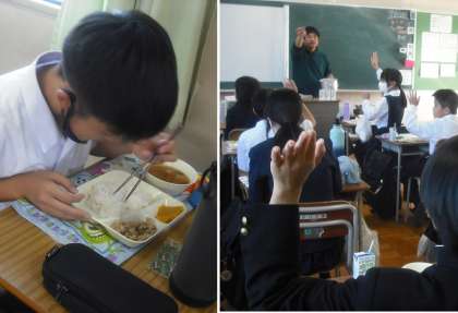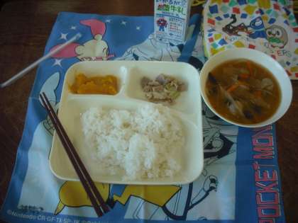 豚肉と野菜のいためものは、タマネギ、キャベツの甘みと醤油味でごはんに合う味付けでした。つみれ汁は、いわしの団子のくさみもなく、ダイコン、ニンジン、ごぼうも加えたみそ汁でした。かぼちゃのういろうは、甘くて柔らかく、デザート感覚で食べました。