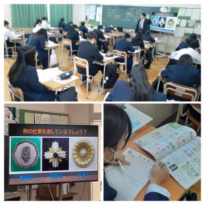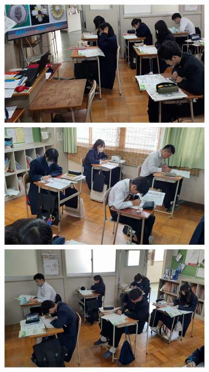 「裁判と人権」というタイトルで、刑事裁判、民事裁判という裁判の種類、最高裁判所、高等裁判所、地方裁判所、家庭裁判所という裁判所の種類について学びました。また、学習の中では、とても多くの難しい専門用語が出てきており、入試にもよく出題されるそうで、生徒も集中して学習に取り組んでいました。