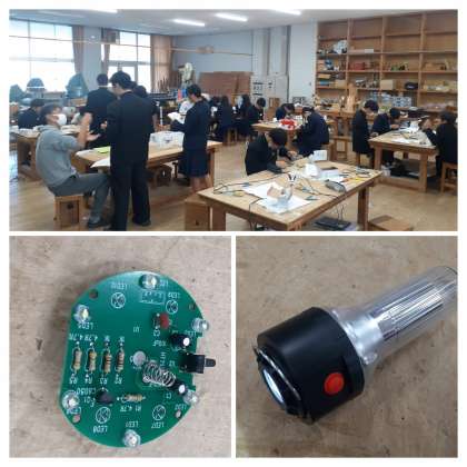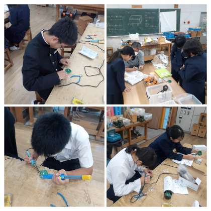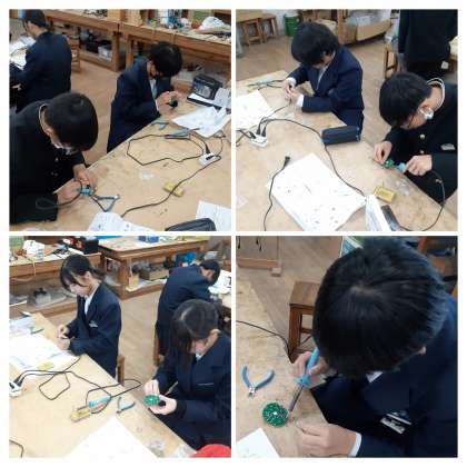 2年生の技術の学習の様子です。実習で「アクティブライト」の組み立て作業を行っています。この実習では「はんだ付け」のスキルを身に付けます。