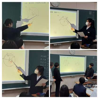 3年生の数学の学習の様子です。今日はいつもと違ってクラスを2分割せずに学習室で「円周角」についての学習でした。