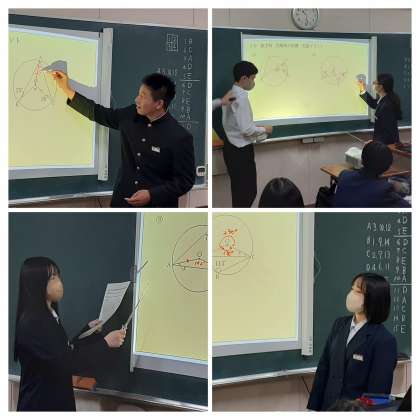 授業の後半は、答え合わせとして、くじで当たった生徒が教卓に出て来て、説明をしました。マーカーで追加説明を加えたり、補助線を書き入れたりするなど、指示棒を使って、緊張しながら説明をしていました。