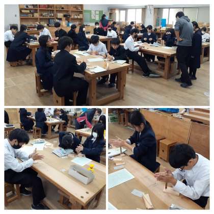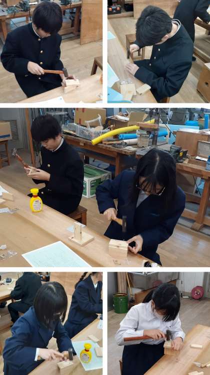 授業の後半、多くの生徒が釘打ちの作業に入り、技術室には「トントン、トントン」とリズミカルな音が鳴り響いていました。途中、釘が曲がってしまい、釘抜きを使って修正しなければならない生徒もいましたが、初回の接合作業としては上手くいっていました。