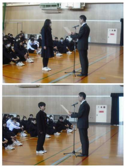 12月9日の全校朝礼にて、2名の生徒の賞状の披露と伝達を行いました。