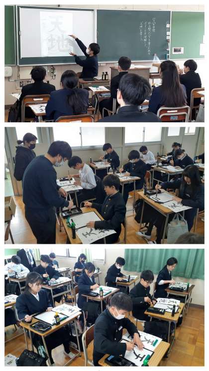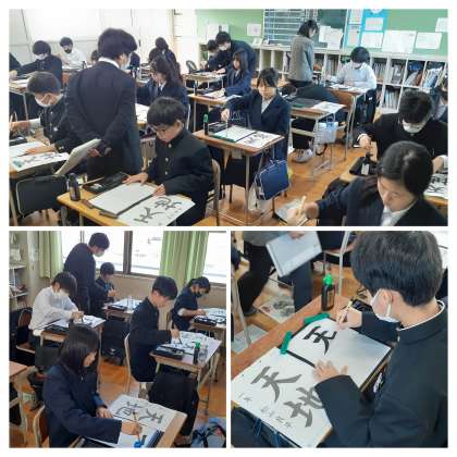 1年生の国語、書写の学習の様子です。中学なって初めての書写の学習です。小学校の時に使っていた書写道具を持ってきてもらっています。