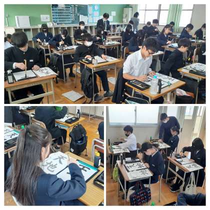 今日は、練習で2枚、清書で2枚の、計4枚を書きます。今日一の作品を選び、名前も小筆で書き、提出です。