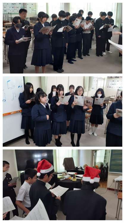 また、授業の最後は、2学期最後の授業ということもあり、季節ものの「クリスマスソングメドレー」の合唱でした。「きよしこの夜」「サンタが町にやってきた」「おねでとうクリスマス」「あわてんぼうのサンタクロース」「赤鼻のトナカイ」「ジングルベル」を楽しそうに歌っていました。