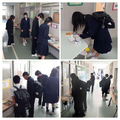 今日は、休み時間は移動教室も多く、生徒の姿はなかなか見られなかったのですが、学活後の放課後、クラブ前や下校前に立ち寄って、本を手に取ってくれていました。