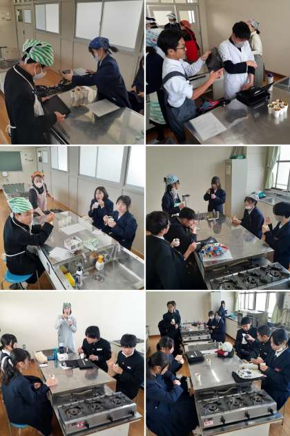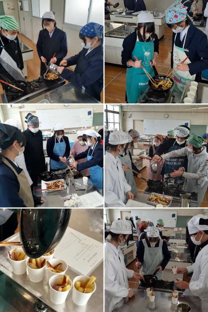 どの班も、調理、洗い物、片付けと役割分担し、協力して作業を進め、時間も余裕をもって調理が終了していました。出来上がった「スティック大学芋」は、端末で記録写真を撮影してから、おいしくいただきました。