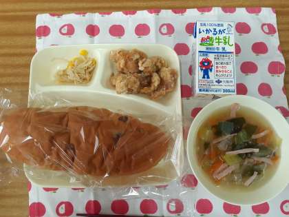 鶏のから揚げは、一口大の鶏肉に、しょうが汁、にんにく、塩コショウでしっかりと下味を付け、でん粉をまぶして、菜種油で表面がカリッとなるよう揚げられていました。大人気のおかずで、もっともっとたくさん欲しいですね。