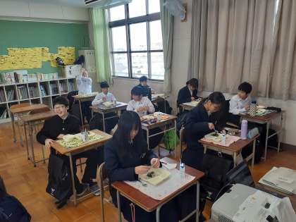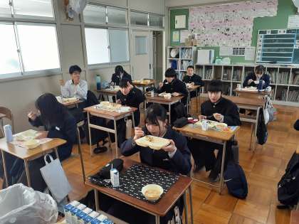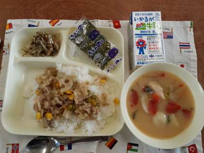 れんこんのちらし寿司は、綿実油で、薄切りで細かくカットした豚肉、れんこん、もどしたかんぴょう、コーンを炒め、砂糖、塩、米酢、しょう油、粉末昆布で味付けをし、最後にグリーンピースが加えられています。配食時にご飯の上に具材を載せ、喫食時に混ぜ合わせて、刻みのりを振りかけていただきました。
