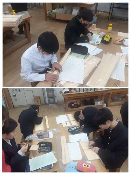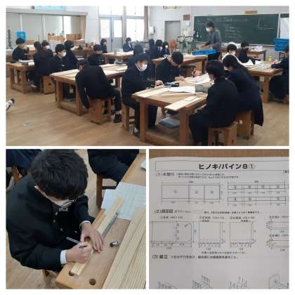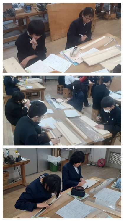 冬休みの課題で、プリントを使って、構想、材料どり(1/2の大きさ)を済ませています。今日からは、600mm×150mm×12mmが1枚、600mm×40mm×12mmが2枚のヒノキ材を用いての本格的な加工実習に入りました。