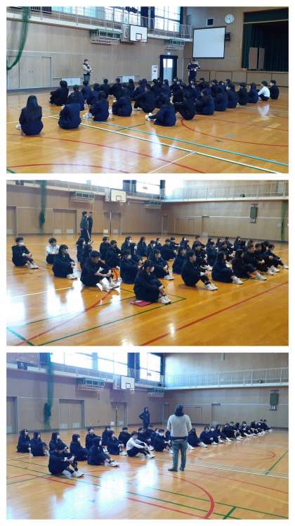 3年生は体育館での集会です。3年生の先生が8時過ぎからエアコンのスイッチを入れてくださっていましたが、なかなか暖まりません。