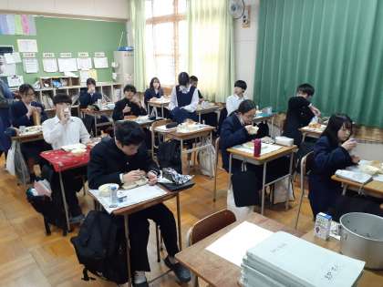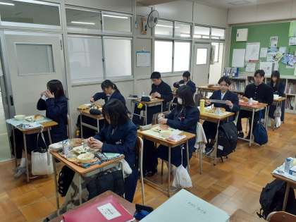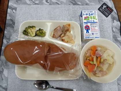 鶏肉とじゃがいものガーリック焼きは、鶏肉をにんにく、塩コショウ、しょう油、オリーブオイルでしっかりと下味を付けた後、じゃがいもを加えて焼き上げられています。ガーリックの風味がよく効いていて生徒も喜んで食べていました。お替りじゃんけんもほぼ全員が参戦です。