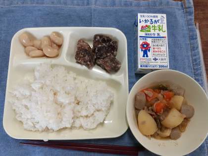 豚肉とじゃがいもの煮物は、削り節の出汁で、料理酒で下味を付けた豚肉と、大きくカットされたじゃがいもと水煮のたけのこ、綱こんにゃく、玉ねぎ、人参を煮込み、砂糖、しょうゆ、塩で味付けをし、最後に三度豆を加えて、しっかりと味が浸み込むまで煮込まれていました。