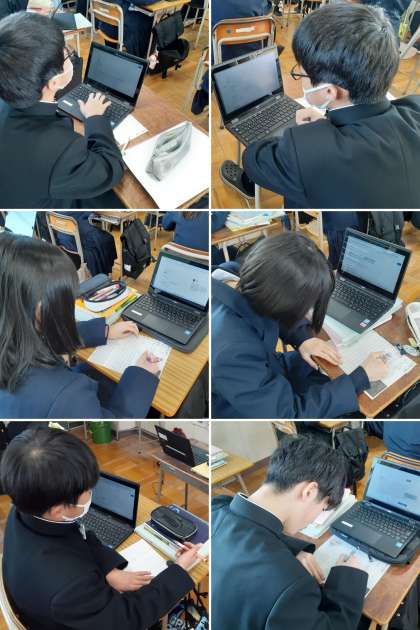 まずは学習者用端末を辞書代わりに使い、選んだ言葉の意味を調べてプリントに記入しました。その後、自身の身近なエピソードなどを思い浮かべながら15分の作成タイムです。