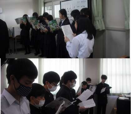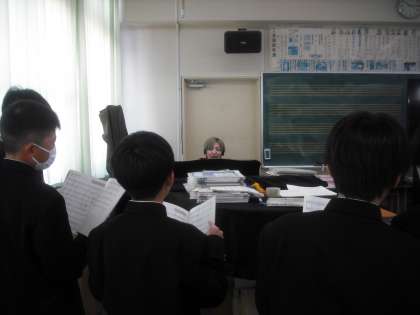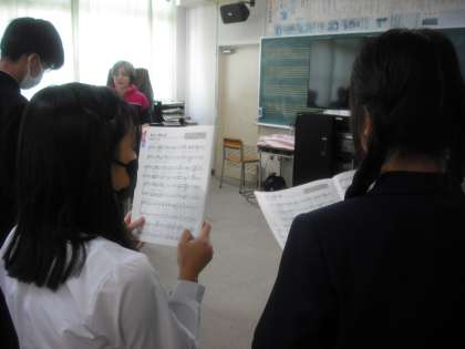 この曲は、テノールとソプラノの2部に分かれており、自分の声の音域を考えて、どちらのパートになるかを決めました。楽譜を見ながら、歌の練習です。先生から、音程で気を付けるところや、リズムなど注意点を教えてもらいました。