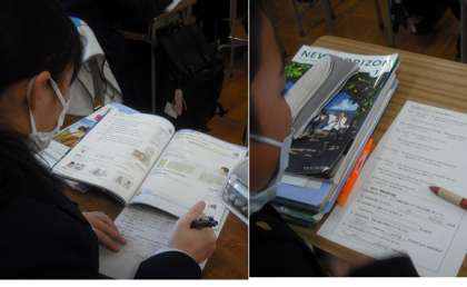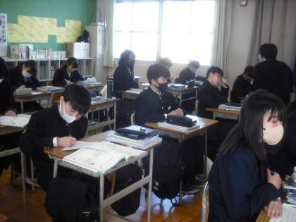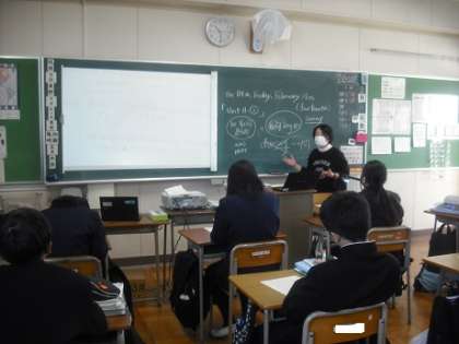1年生英語の授業の様子です。今日は、過去進行形の文例を学習しています。