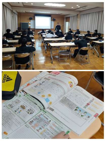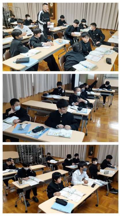 1年生の男子の保健の学習の様子です。昨日までに持久走の学習が終わり、今日は、多目的室で保健分野の「ストレス」について学習をしていました。