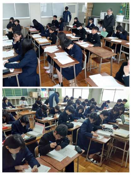 写真は、2年生の数学の様子です。出席番号順に解答用紙が返却され、模範解答も配布されます。