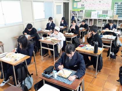 みそ汁は、昆布と削り節の合わせ出汁に、人参、白菜、えのきたけが具材で、赤みそと白みその合わせみそです。最後に薬味で刻んだ青ねぎも加えられています。