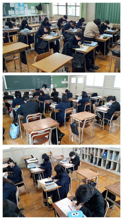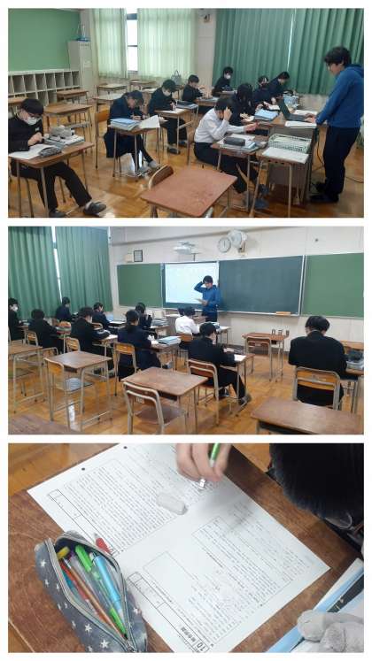 1年生の英語の学習の様子です。1クラスを2分割しての10名程の少人数学習で、プリントを用いた「総合問題」に取り組んでいました。