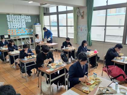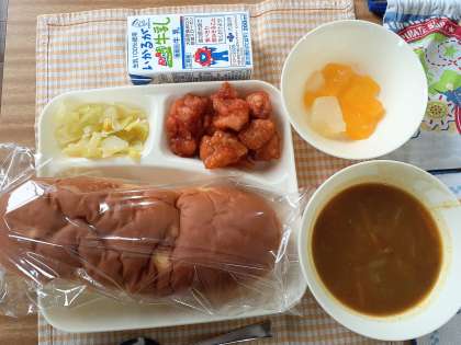 揚げ鶏のバーベキューソースは、一口大の鶏肉をワインとにんにくで下味を付け、でん粉をまぶして菜種油でカラッと揚げます。ケチャップ、トンカツソース、ウスターソース、砂糖、お湯を合わせて煮立たせ、配缶時に揚げた鶏肉に絡ませてあります。生徒には大好きな味付けでした。