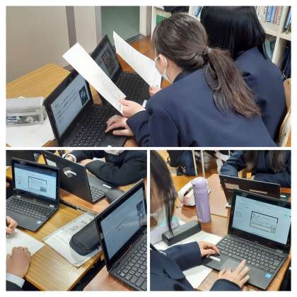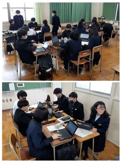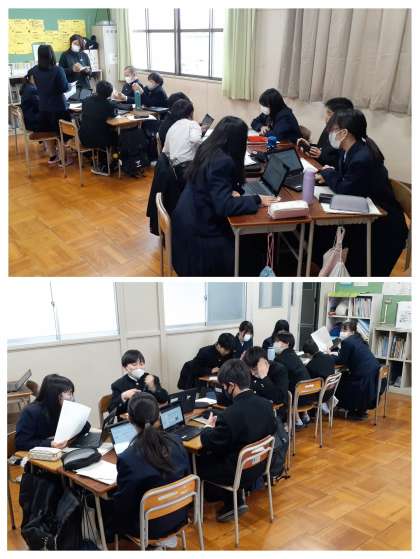 訪問した事業所ごとの班に分かれ、学習者用端末を使ってのスライドの制作、発表用原稿の作成、読み・説明の練習を行いました。生徒たちは、班内で役割分担をし、それぞれの作業について責任をもって進めていました。