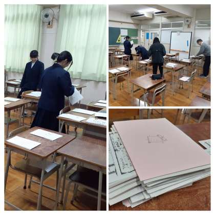 3年生の学習室では、「卒業文集」の製本作業(ページ合わせ)を行っていました。原稿は仕上がり、印刷も完了。今日は、机を整然と並べ、表紙からページ順に並べ、文集担当の生徒さん2人と、先生とで、アナログ方式で黙々と作業を行っていました。