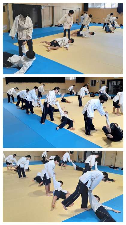 後半は、投げ技に挑戦です。「支え釣り込み足」で、ペアになり、受けの人は膝を着いた姿勢の低い状態からの「投げ」「受け身」の練習をしました。「投げ」も右足前さばき、左足前さばきと、左右両方から習いました。今後も、投げ技の種類を増やしていくそうです。