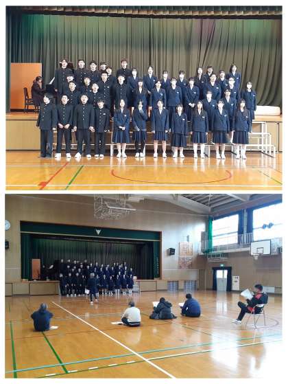 これまでも、音楽の時間や、学年での取り組みで、音楽室などで練習はしていましたが、今日は、広い体育館で、ひな段も組んで、生徒のピアノ伴奏での、初めての練習です。