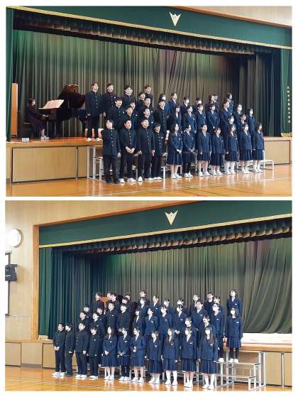 3年生が5時間目に体育館にて、卒業式で歌う「旅立ちの日に・・・」の練習をしていました。