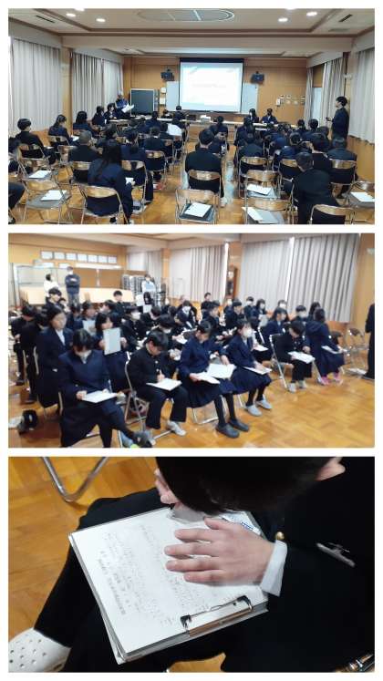 1年生は、5・6時間目の2コマを使って、多目的室で「職場訪問学習発表会」を行いました。発表順は、朝の学年集会の後半にくじで決めたそうです。