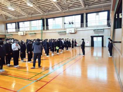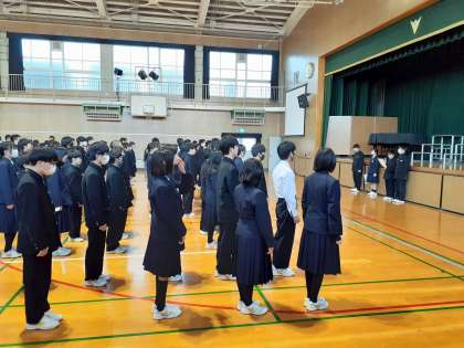 雲一つ無い快晴で、とても清々しい朝となりました。月曜日の朝です。週末に卒業式を控え、今日は3学年そろっての最後の全校朝礼の日となりました。