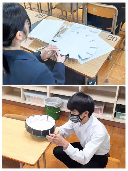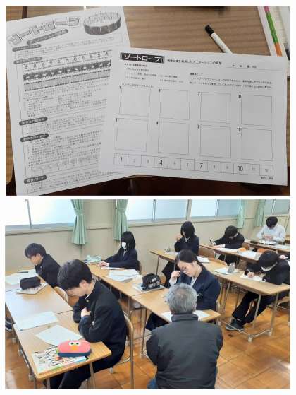 1年生の美術の学習の様子です。「絵文字」が完成し、次の題材として「ゾートロープ」に取り組んでいます。